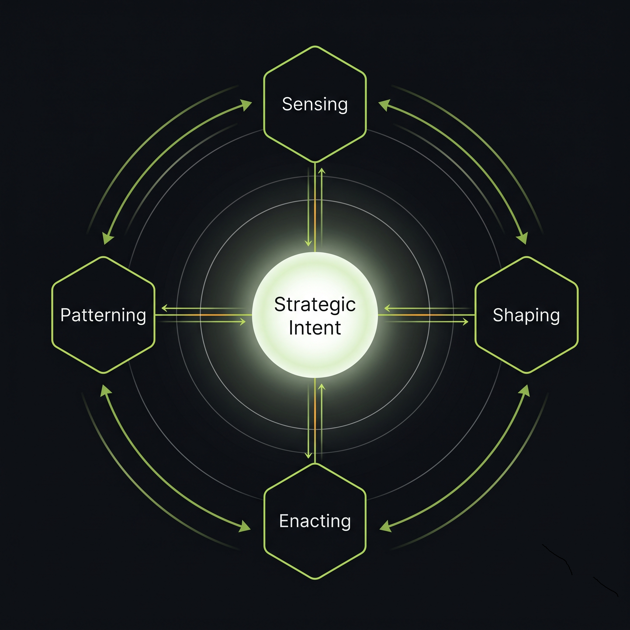 Signals become strategic direction, and direction becomes the conditions under which the organization can act on it. The hidden pillar most operating models skip — the one that makes execution feel natural, not bolted on.